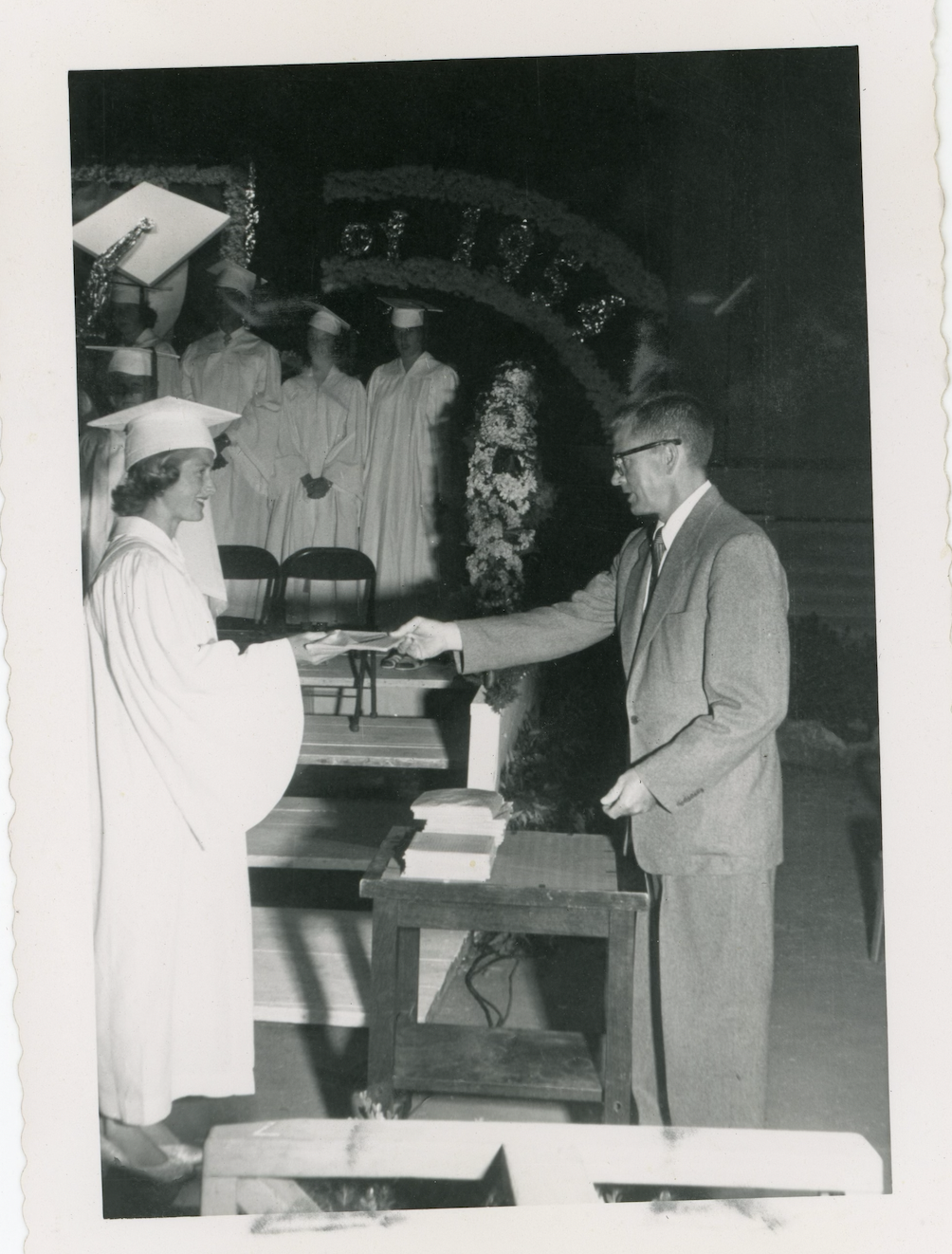 Here’s an image of her grandma, Loraine Hollingsworth graduating LBHS in 1954!
