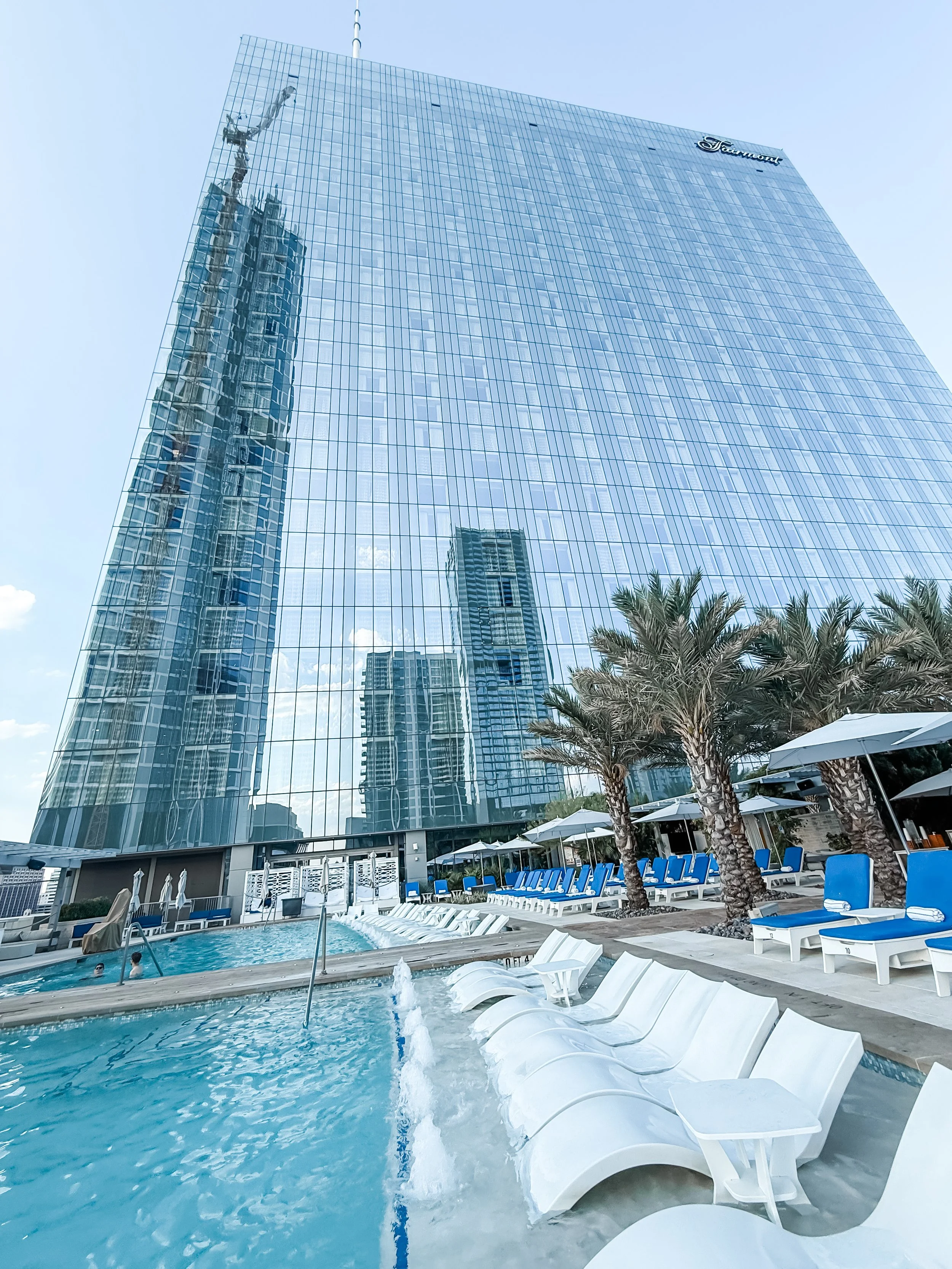 When we got back, we headed to the rooftop pool and jacuzzi. Between the skyline views and the mirrored hotel reflecting the clouds, it honestly felt like a movie scene.