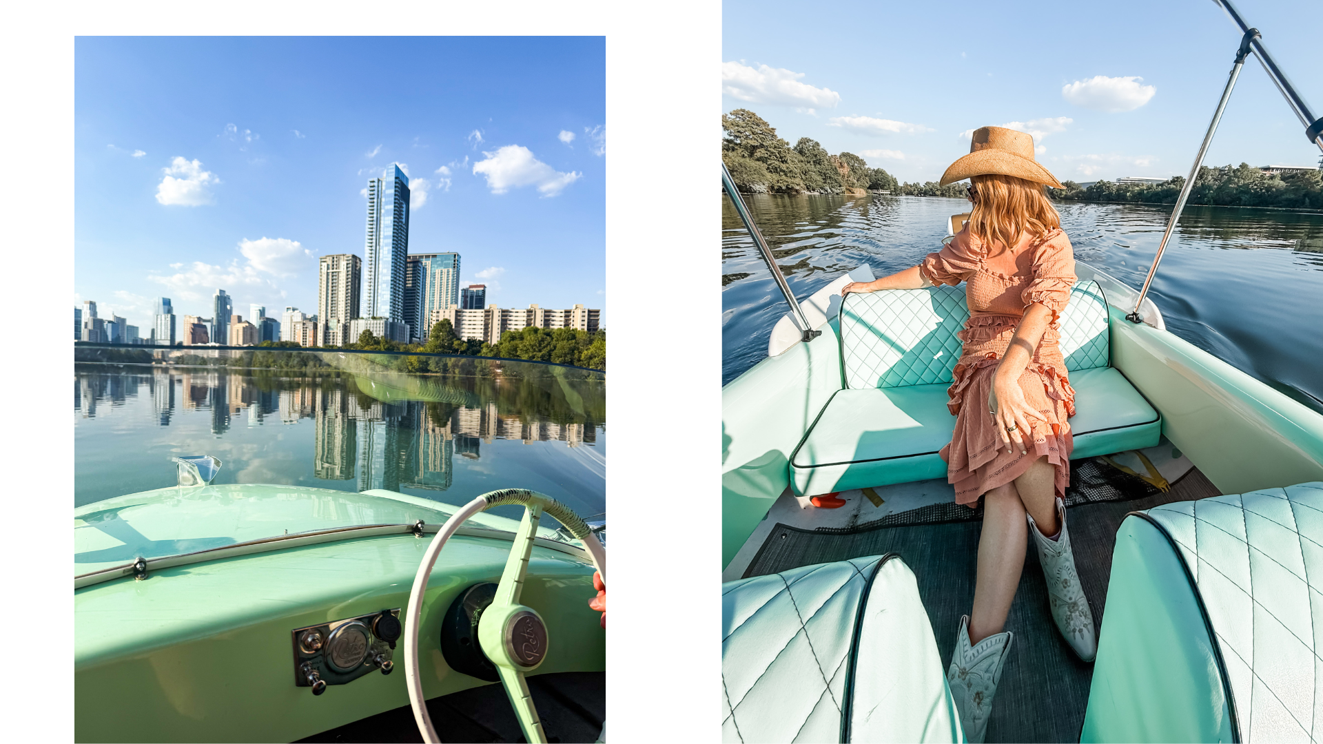 Later that afternoon, we popped open some prosecco and made our way back to Lady Bird Lake — this time for a ride with Retro Boat Austin. Picture a little green vintage boat cruising down the water, skyline views ahead, music playing, and people jogging by on shore. It’s one of those “why don’t we have this in Laguna?” moments.